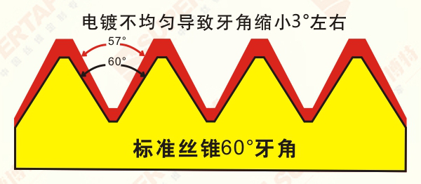 經過改變絲錐的牙形角度,施工出來的牙角度變大,電鍍以后,角度變小,恢復到標準角度。